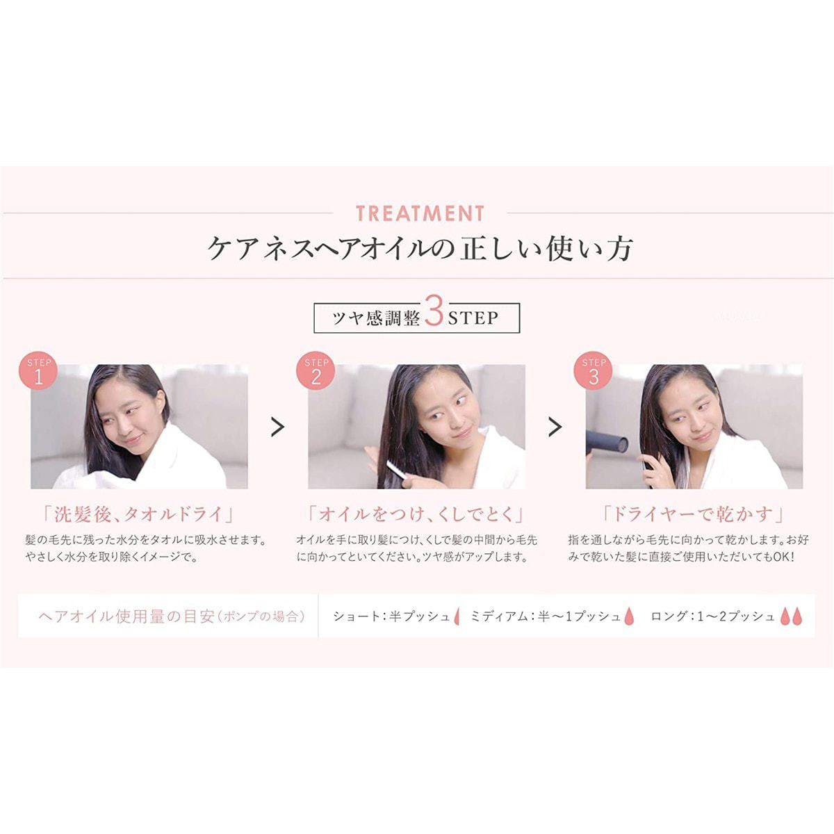 【使用量の目安】ショート:半プッシュ/ミディアム:半〜1プッシュ/ロング:1〜2プッシュ