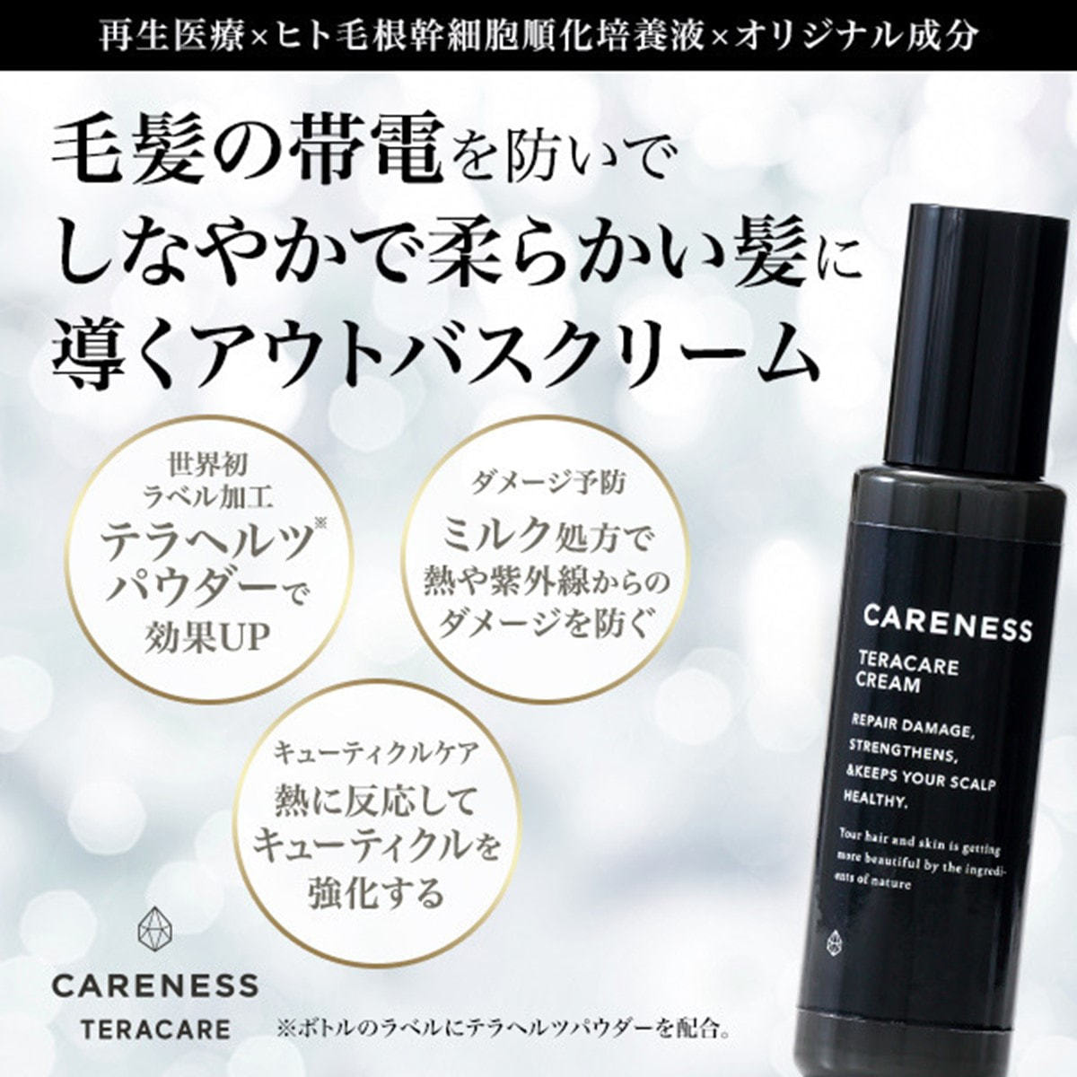 水、グリセリン、ジメチコン、BG 、ベヘニルアルコール 、セテアリルアルコール、セタノール、サッカロミセス/(コメ/コメヌカ)発酵液、ヒト毛根細胞順化培養液、バチルス/(バラ花/ダイズ)発酵液、ホホバ種子油、ツバキ種子油、アルガニアスピノサ核油、加水分解ケラチン(羊毛)、加水分解シルク、γ-ドコサラクトン、加水分解コンキオリン、ステアルトリモニウムクロリド、フェノキシエタノール、アモジメチコン、イソプロパノール、PEG-200水添ヒマシ油、セバシン酸ジエチル、クエン酸、乳酸、メチルパラベン、香料